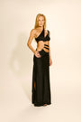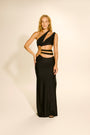 Vestido longo, modelo é assimétrico com alça única que cruza sobre o ombro e busto, criando um decote diferenciado e moderno. Possui recorte lateral amplo que deixa parte da cintura e abdômen à mostra.