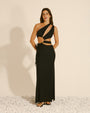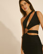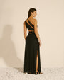 Vestido assimétrico com recortes frontais franzidos ajustáveis amarrados com cordões e fenda frontal