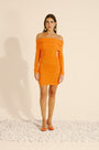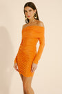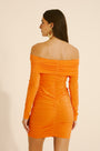 Vestido curto ombro a ombro de mangas longas com drapeado.