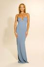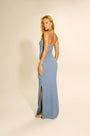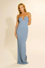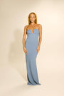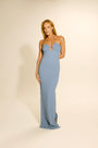O modelo possui busto estruturado com recorte central em gota. As alças finas em corrente metálica dourada, formando um decote que alonga a silhueta e adiciona leve brilho ao look.