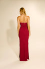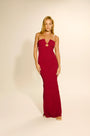 O modelo possui busto estruturado com recorte central em gota. As alças finas em corrente metálica dourada, formando um decote que alonga a silhueta e adiciona leve brilho ao look.