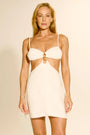 Na parte frontal, o vestido conta com dois recortes estratégicos conectados por argolas metálicas douradas.