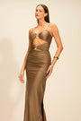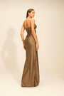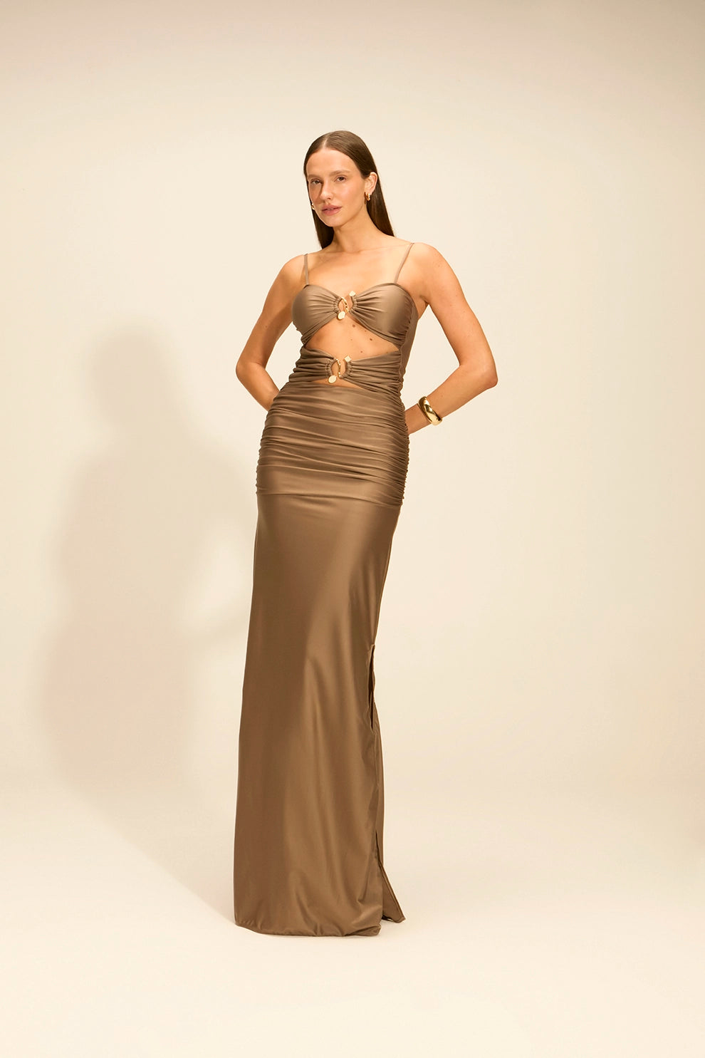 Vestido longo com alças reguláveis e recortes estratégicos no tronco, que valorizam a silhueta com equilíbrio e leveza. O aviamento no busto e na cintura cria pontos de destaque no design, trazendo sofisticação sem excesso. A modelagem tem caimento fluido e acompanha o corpo com conforto e elegância.