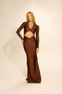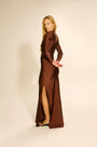 Vestido longo em lycra brilho, com toque sedoso e caimento fluido. A peça possui decote em V com travete dourado, as mangas longas ajustadas equilibram o recorte frontal, valorizando a silhueta. A saia tem modelagem reta, franzido na cintura e fendas laterais que garante leveza e movimento ao andar.