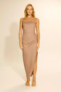A saia tem comprimento midi alongado e conta com recorte lateral drapeado, com uma fenda alta unilateral. O acabamento assimétrico na barra alonga a silhueta.